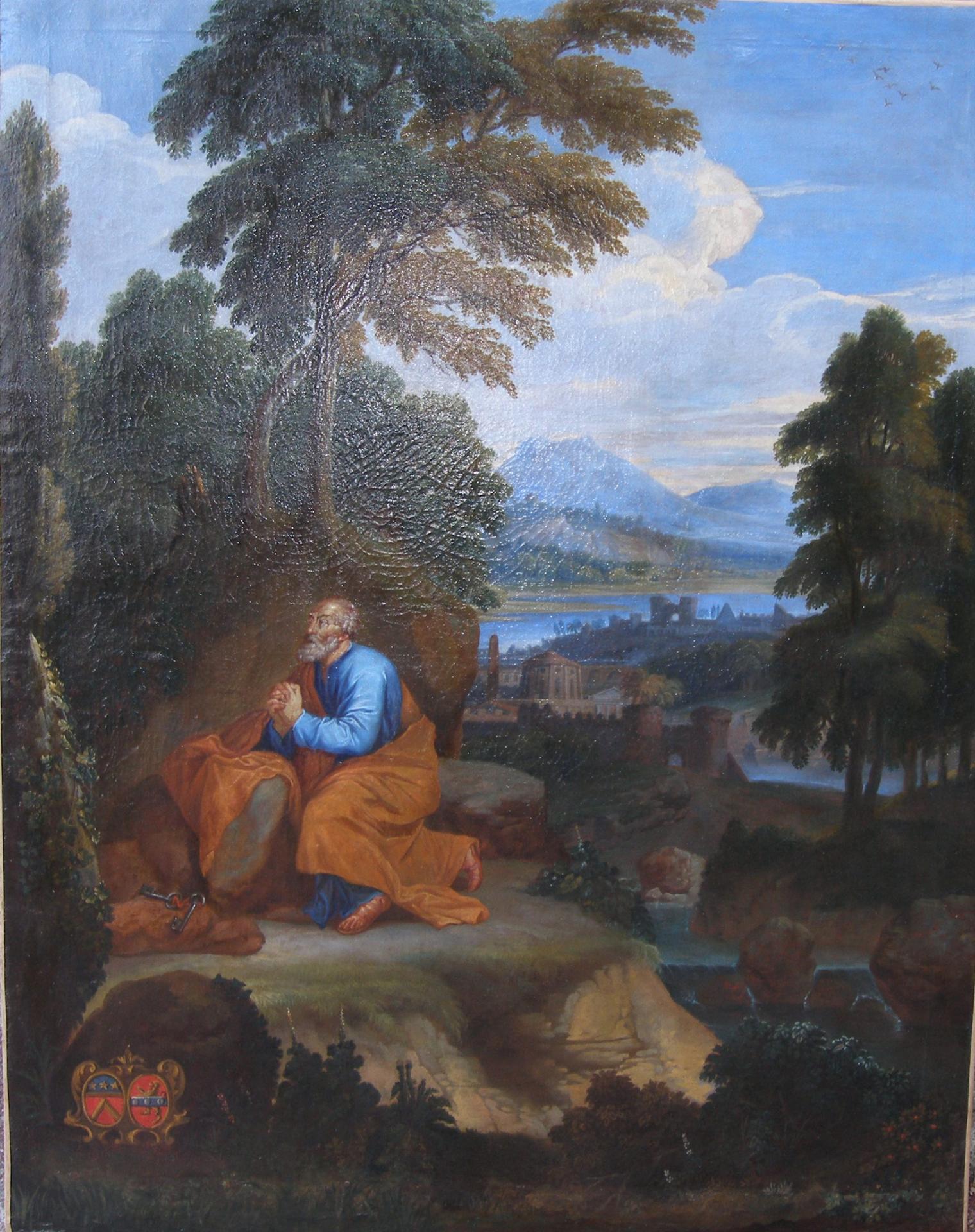 Les repeints : La petite montagne de droite en arrière-plan était imposante, de forme rectangulaire, peinte dans un bleu indigène au tableau. Le bas de la toile ayant été en grande partie détruit, est couvert d’un mastic sur toute la longueur avec 3 cm de hauteur ; les repeints faits à la hâte laissaient entrevoir chaque coup de pinceau. A la droite de St Pierre, une large bande noire masquait les ornements floraux. La robe de Saint Pierre était, à l’endroit de la déchirure, couverte d’une épaisse «cicatrice» de mastic et les repeints grossiers n’étaient pas dans la tonalité.
